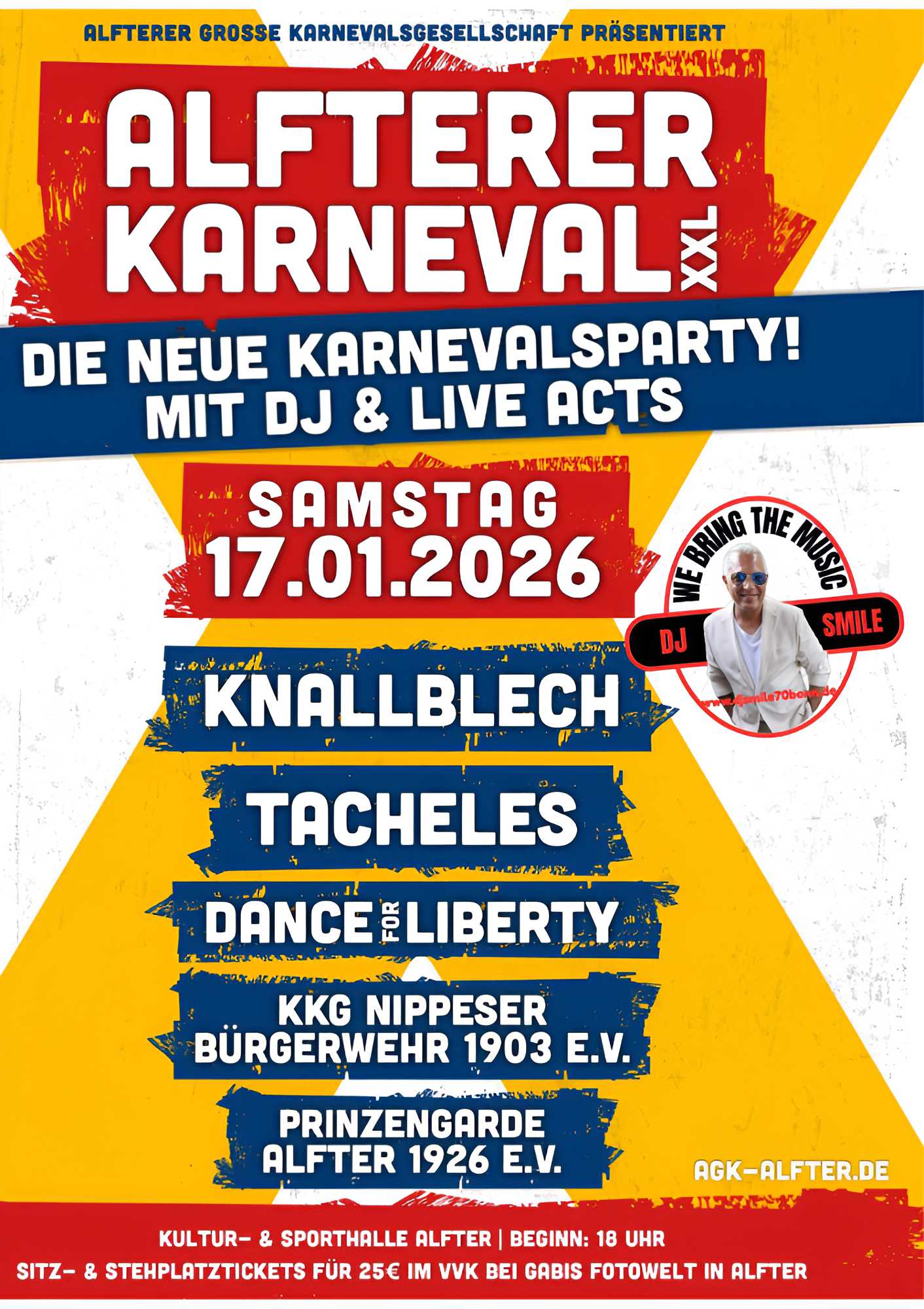 Liebe Jecken aus der Umgebung, nach Weihnachten und Silvester geht es endlich wieder los – Karneval steht vor der Tür! 🥳 Also merkt euch den Termin: 17.01.2026 👉 Die neue Karnevalsparty in Alfter! Mit DJ Smile 🎧 und Live-Acts ist beste Stimmung garantiert. Sichert euch eure Karten, kommt vorbei und feiert mit uns – denn in Alfter ist immer was los! Aktion: 10 Ticktes für 280€ plus eine Kiste Kölsch gratis dazu. Termin 17.Januar 2026 Einlass 17.00 Uhr Beginn 18.00 Uhr Ticketpreis 25 € VVK ab 5.11.25: Gabis Fotowelt Am Herrenwingert 14, Alfter Ich freu mich auf euch Euer DJ Smile 🎶🎉